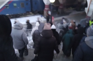 Все побежали вниз по ступенькам. Скользко. Вагоны забиты до отказа (Видео)