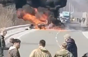 Автомобиль горит на трассе в Приморье: движение парализовано