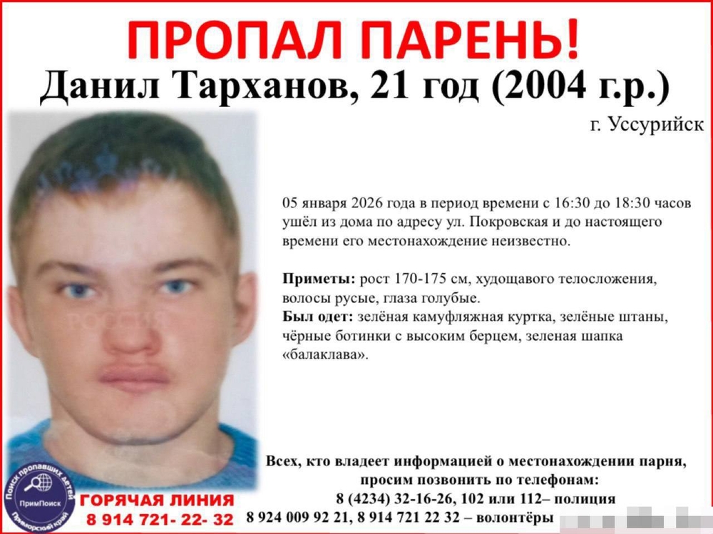 21-летний парень ушел из дома 5 января и до сих пор не найден в Уссурийске