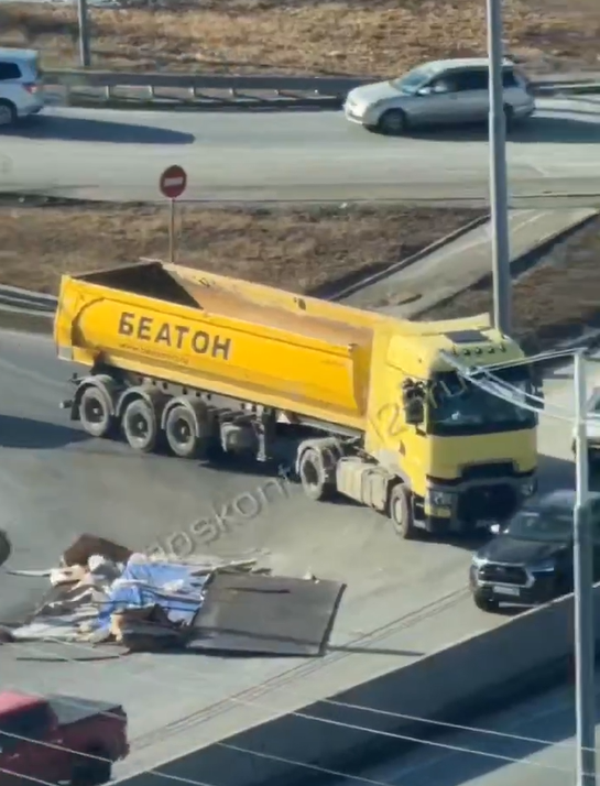Железный лист рухнул с тягача на дорогу во Владивостоке